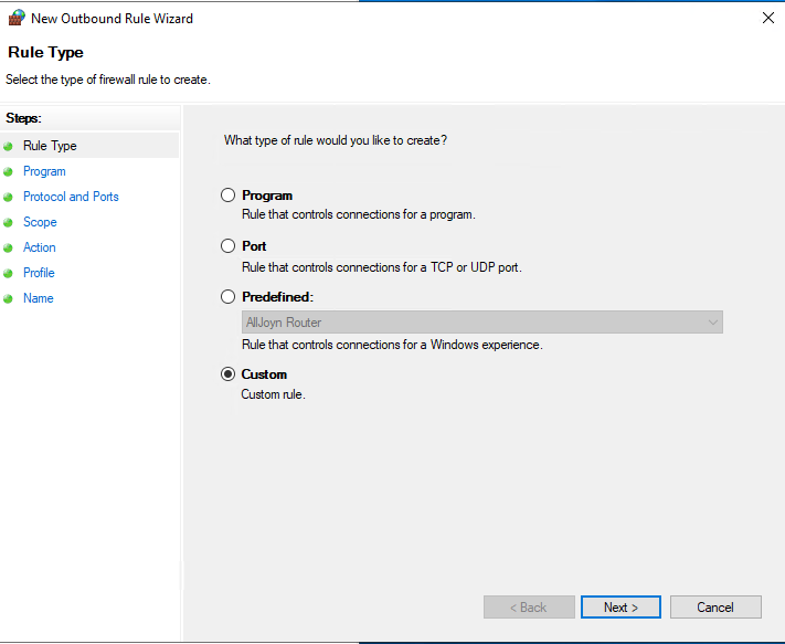 ۴. در پنجره باز شده، گزینه Custom را انتخاب کرده و بر روی Next کلیک کنید.