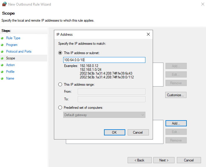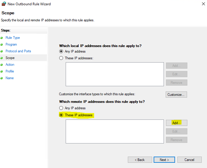 7. در این قسمت شما میتوانید محدودۀ IP های خصوصی را بلاک کنید. تنها لازم است در بخش Which remote IP addresses does this rule apply to گزینه These IP addresses را انتخاب کرده و بر روی Add کلیک کنید و رنج IPهای مورد نظر را اضافه کنید. سپس بر روی Next کلیک نمایید.