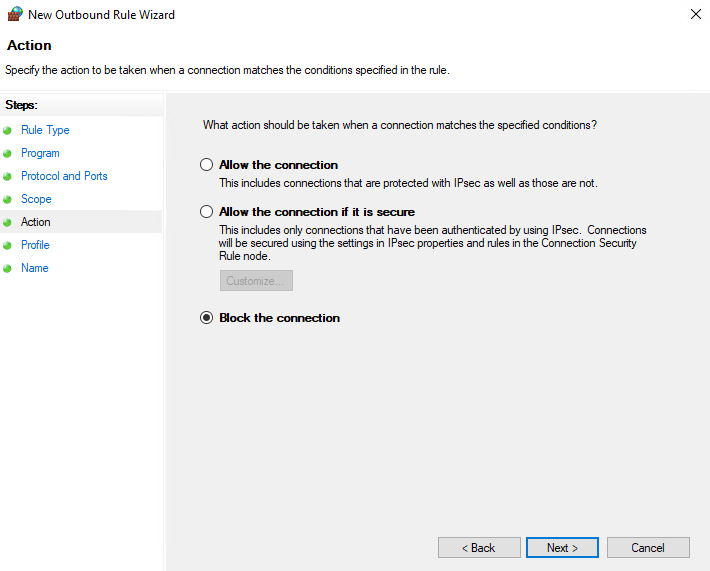 ۸. در این قسمت گزینه Block the connection را انتخاب کرده و بر روی Next کلیک کنید.