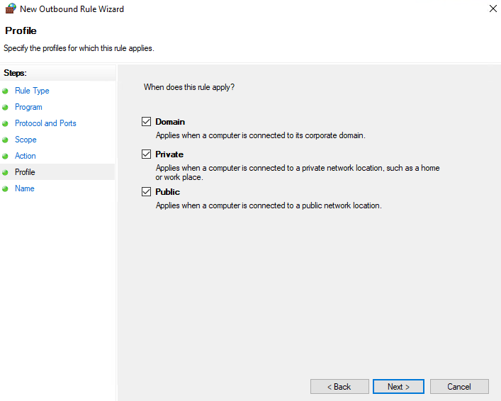 ۹. در بخش Profile تیک تمام گزینهها را بگذارید و بر روی Next کلیک کنید.